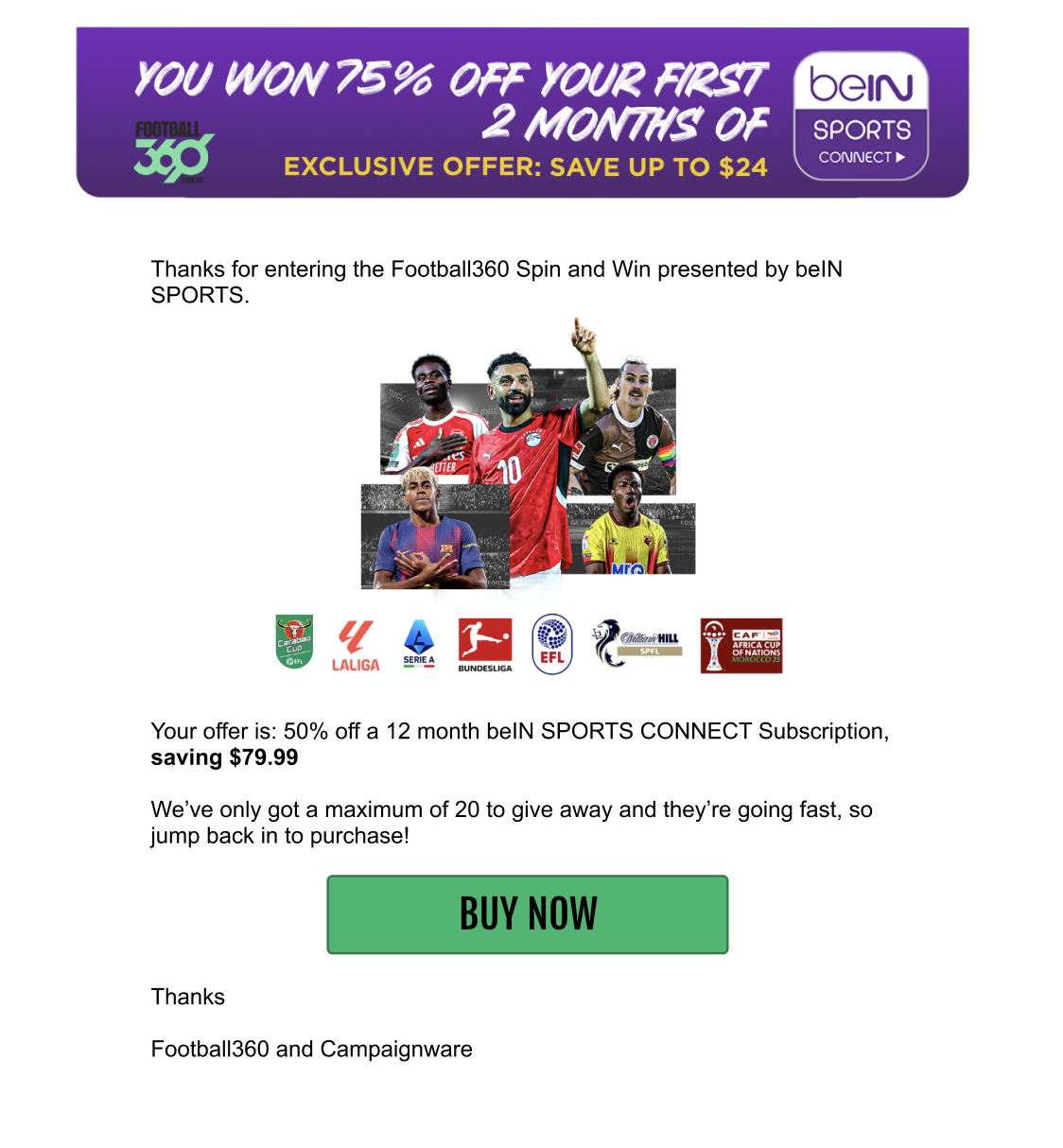 To promote beIN SPORTS CONNECT, Football360 used Campaignware to launch a Spin and Win campaign that turned casual browsers into paying subscribers. Built in under two weeks and promoted across Football360’s website and socials, the activation offered three discount outcomes with instant fulfillment.